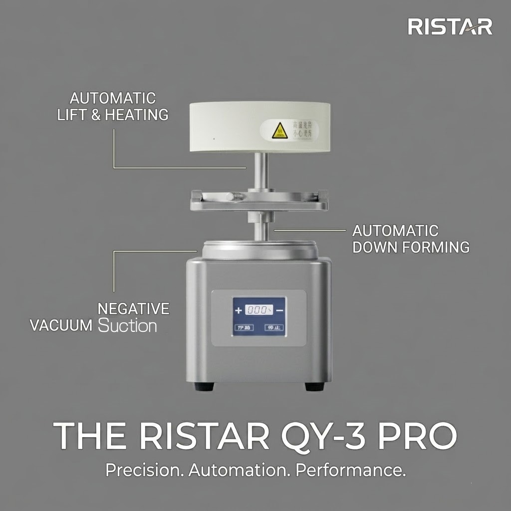 The machine features automatic heating to soften films quickly and evenly for optimal results. It performs a seamless sequence of automatic lifting for the heater and smooth downward movement for forming.