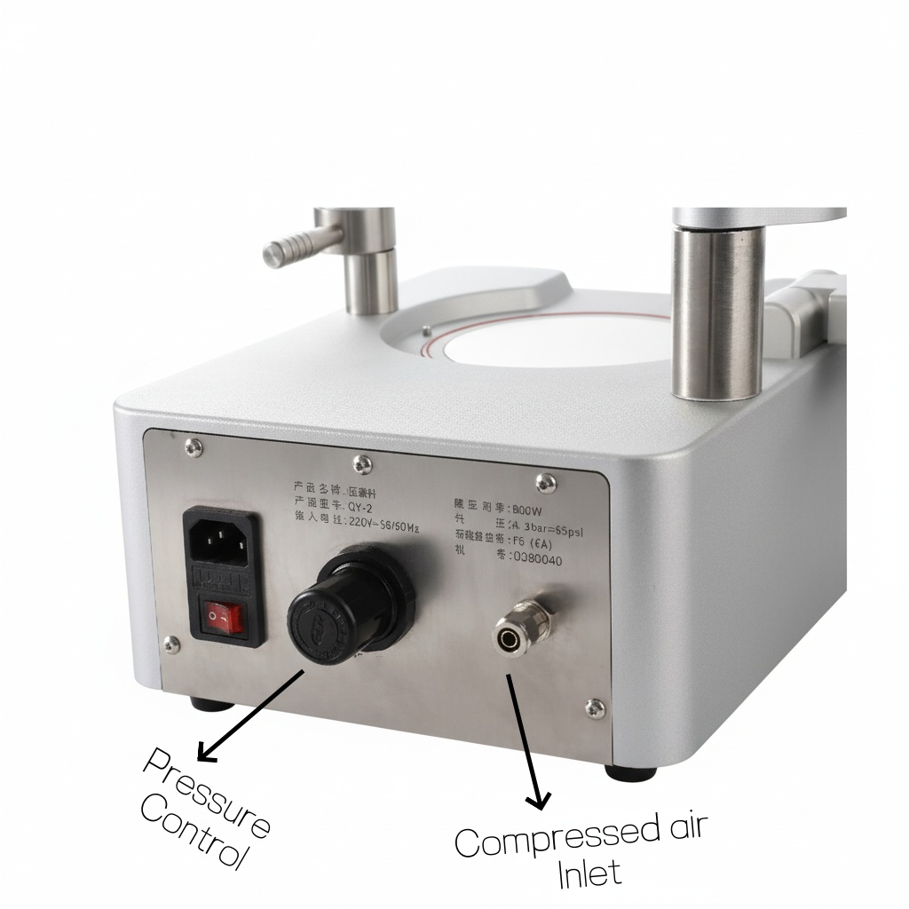 - Connect the external 8mm air hose and power cord to the rear panel, then turn on the red power switch.