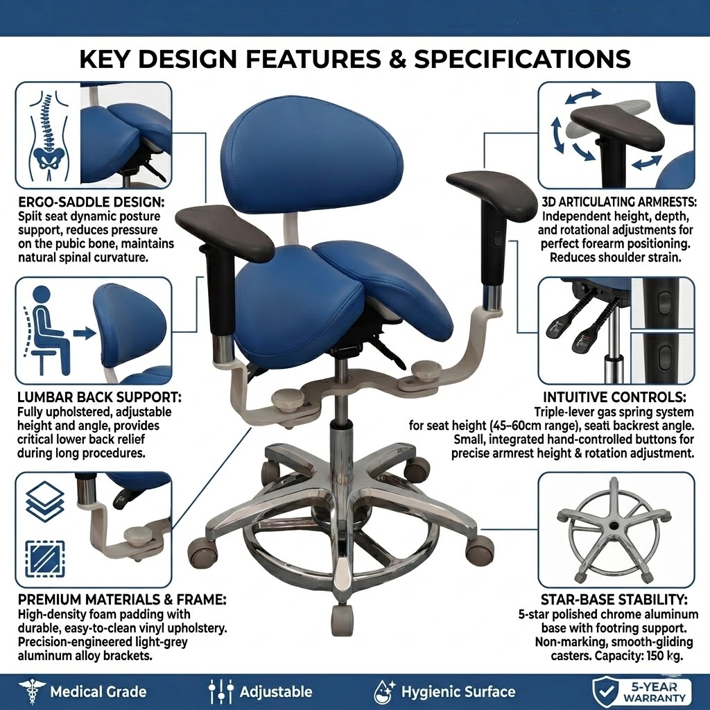 Engineered for hospital and dental professionals, this ergonomic saddle stool features a triple-gas lever system and button-controlled adjustable armrests to reduce fatigue.