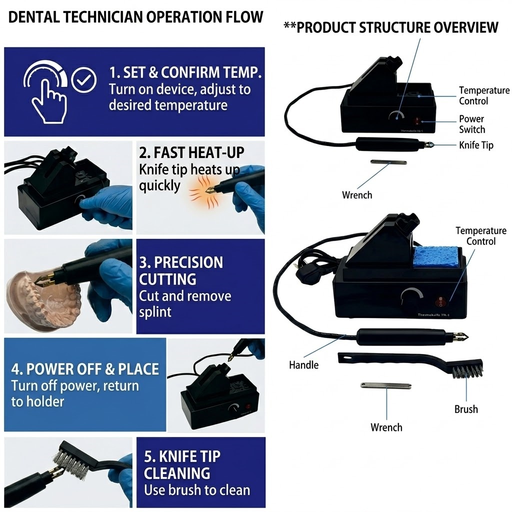 The thermal splint cutter is a high-efficiency electric thermal knife designed for the modern dental lab bench.
